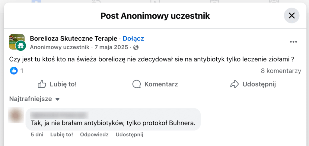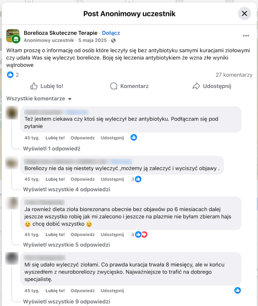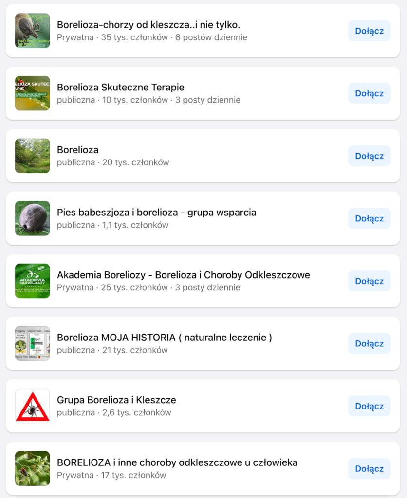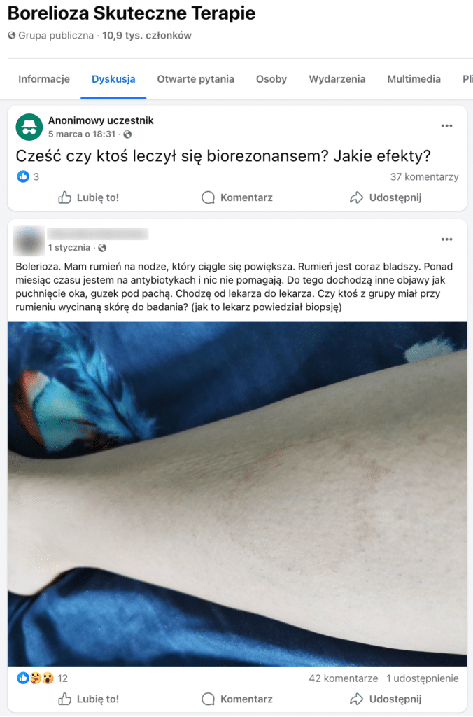 Wystarczy odwiedzić jedną z publicznie dostępnych grup, aby trafić na fałszywe lub wprowadzające w błąd wypowiedzi o chorobie z Lyme. Amatorskie porady dotyczące nieskutecznych metod diagnostyki, pseudonaukowe interpretacje opisywanych objawów lub wyników badań czy promocja niepotwierdzonych naukowo sposobów leczenia boreliozy, w tym licznych suplementów, to częste wątki poruszane na tego typu forach.