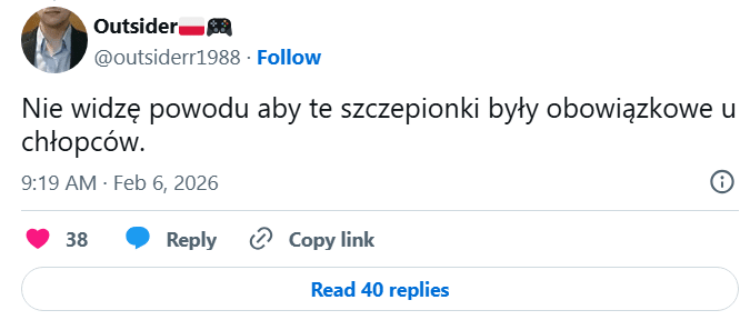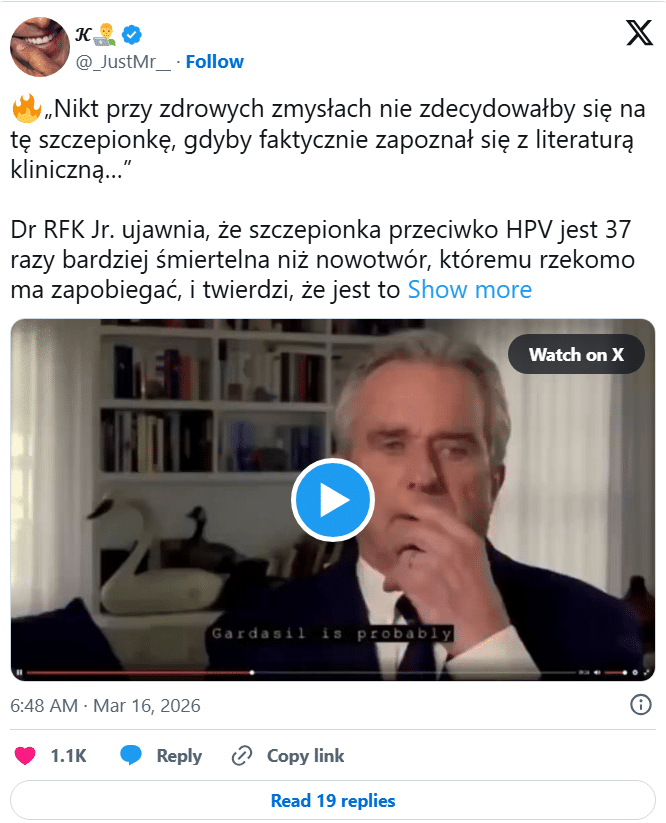 W połowie marca 2026 r. na platformie X pojawił się wpis o następującej treści: „Nikt przy zdrowych zmysłach nie zdecydowałby się na tę szczepionkę, gdyby faktycznie zapoznał się z literaturą kliniczną…”. Autor posta powołuje się w nim na niejakiego „dr. RFK Jr.”, który rzekomo miał ujawnić, że szczepionka przeciwko HPV jest 37 razy bardziej śmiertelna niż nowotwór, któremu zapobiega. Nazywa ją przy tym „najgorszą masową szczepionką, z jaką kiedykolwiek mieliśmy do czynienia”.