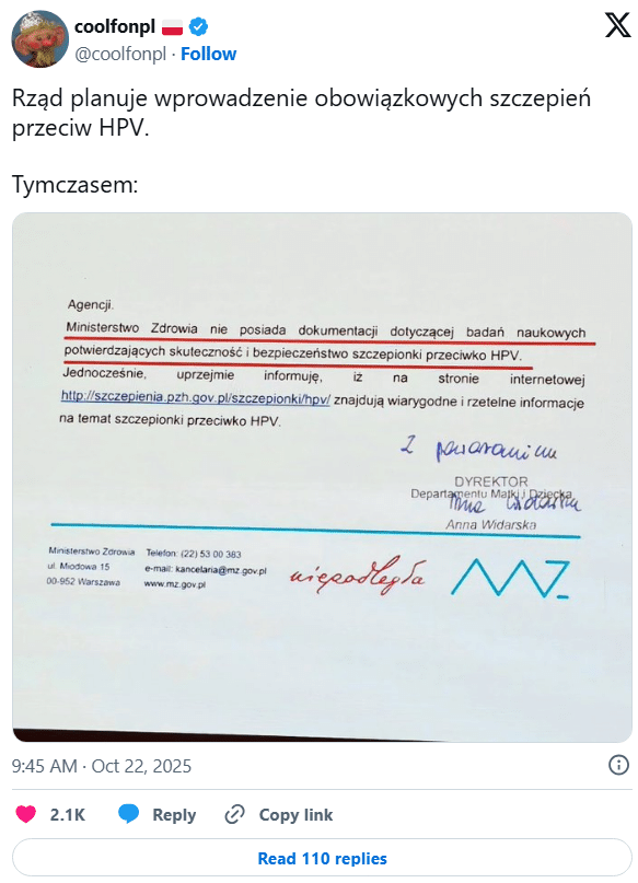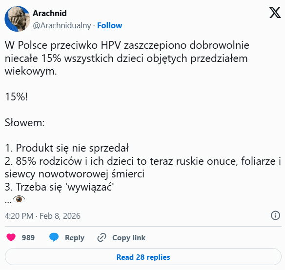 Według jednego z wpisów opublikowanych na X w Polsce na HPV „zaszczepiono dobrowolnie niecałe 15% wszystkich chętnych dzieci objętych przedziałem wiekowym”: