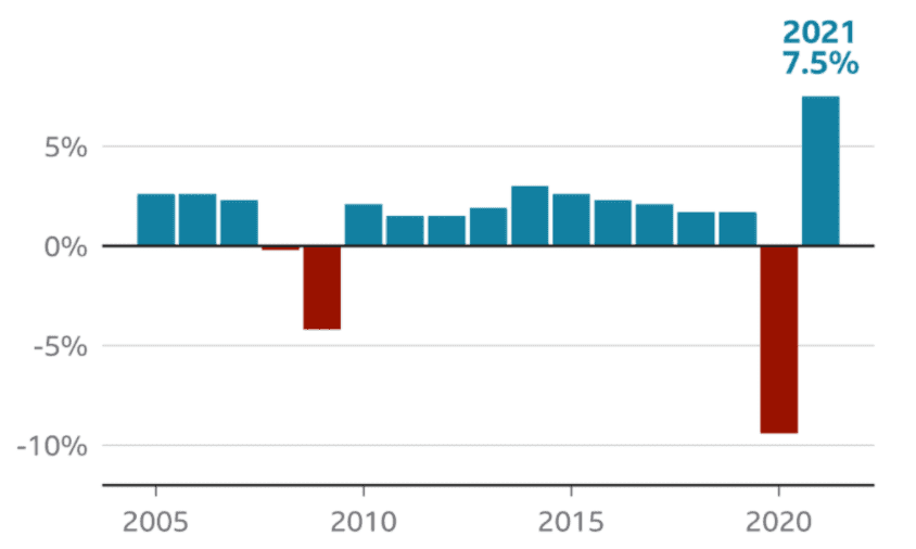 11 lutego 2022 roku brytyjski urząd statystyczny (ang. The Office of National Statistics, ONS) opublikował szacunkowe dane dotyczące wzrostu PKB Wielkiej Brytanii w ostatnim kwartale 2021 roku. Wspomina tam także o podniesieniu się tego wskaźnika o 7,5% w przeciągu całego ubiegłego roku. Według statystyk prowadzonych przez Bank Anglii, jest to najszybszy skok od czasów II Wojny Światowej (1941 r.). Nie jest to jednak zjawisko nietypowe – jak podkreśla brytyjski urząd statystyczny, wzrost PKB nastąpił chwilę po dramatycznym zapadnięciu się gospodarki o 9,4%, gdy w 2020 r. Wielka Brytania wprowadziła poważne restrykcje w odpowiedzi na rosnące fale zakażeń koronawirusem. Przyczyną tak gwałtownego wzrostu gospodarczego nie był zatem Brexit.