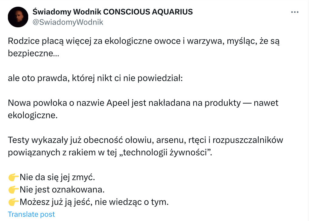 „Rodzice płacą więcej za ekologiczne owoce i warzywa, myśląc, że są bezpieczne… ale oto prawda, której nikt ci nie powiedział: Nowa powłoka o nazwie Apeel jest nakładana na produkty — nawet ekologiczne. Testy wykazały już obecność ołowiu, arsenu, rtęci i rozpuszczalników powiązanych z rakiem w tej »technologii żywności«” – ostrzega jeden z użytkowników platformy X. W komentarzach autor wpisu dodaje, że za stworzenie rzekomo szkodliwej powłoki ma odpowiadać Bill Gates.