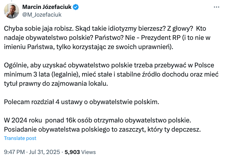 Z kolei poseł Włodzimierz Skalik twierdzi: „To że ktoś ma obywatelstwo polskie nie oznacza, że jest Polakiem. Zwłaszcza dzisiaj, kiedy państwo polskie rozdaje Ukraińcom obywatelstwa niczym cukierki”. Wśród licznych komentarzy do posta Skalika pojawił się wpis posła Marcina Józefaciuka, którego fragment brzmi: „Skąd takie idiotyzmy bierzesz? Z głowy? Kto nadaje obywatelstwo polskie? Państwo? Nie – Prezydent RP (i to nie w imieniu Państwa, tylko korzystając ze swoich uprawnień)”.