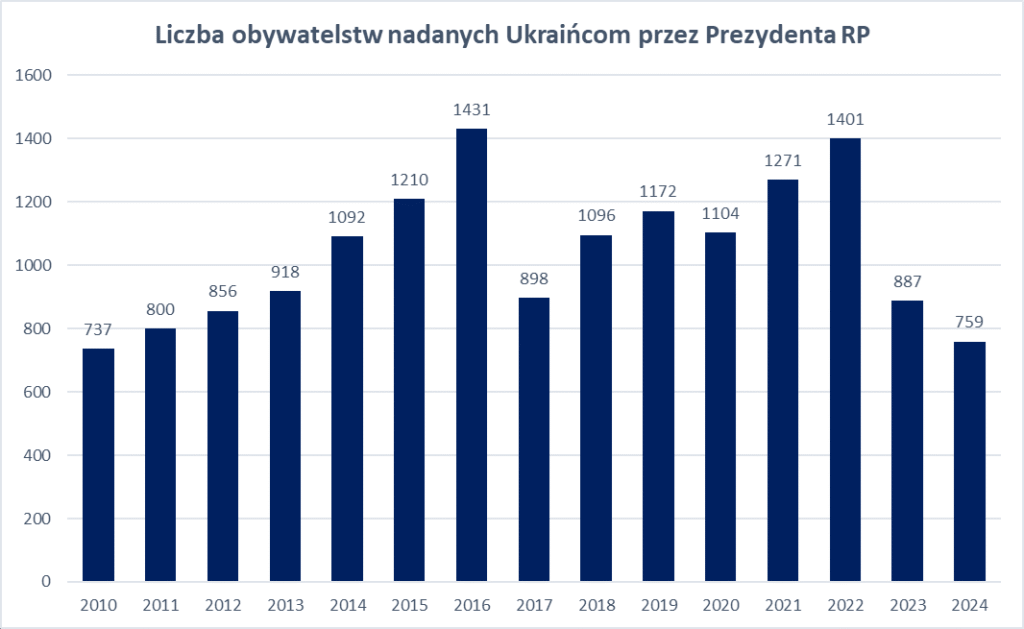 Na poniższym wykresie przedstawiona jest liczba obywatelstw nadanych Ukraińcom przez Prezydenta RP w latach 2010-2024.