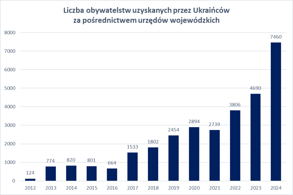 - W 2024 roku obywatelstwo polskie uzyskało 8219 Ukraińców, co stanowi ok. 50% wszystkich nadanych w zeszłym roku obywatelstw i 0,022% ludności Polski.