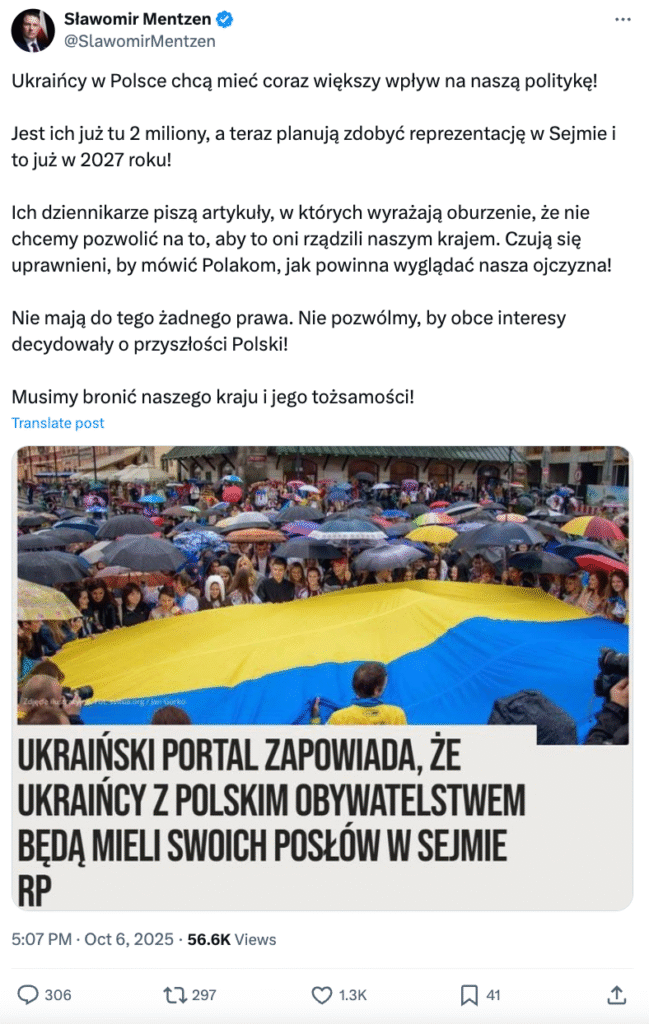 Publikacja Kresy.pl była szeroko komentowana na platformie X. „Ukraińcy w Polsce chcą mieć coraz większy wpływ na naszą politykę! Jest ich już tu 2 miliony, a teraz planują zdobyć reprezentację w Sejmie i to już w 2027 roku! Ich dziennikarze piszą artykuły, w których wyrażają oburzenie, że nie chcemy pozwolić na to, aby to oni rządzili naszym krajem […] Nie pozwólmy, by obce interesy decydowały o przyszłości Polski!” – zaapelował poseł Sławomir Mentzen we wpisie na X. Inny użytkownik portalu zapytał: „Naprawdę chcecie tego żeby kmioty z 🇺🇦 decydowały jak ma wyglądać Polska ???” (pisownia oryginalna).